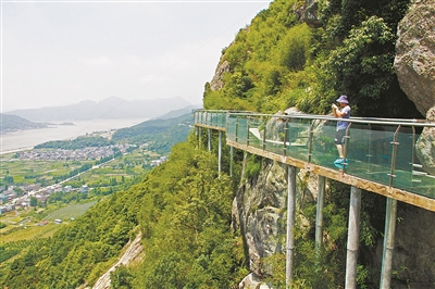 玻璃棧道沿山懸空而建,山海風光盡收眼底,迅速成為“網紅”景點。不少村民成為景區的“員工”,實現了就地就業。白巖下村與象山縣蟹鉗港旅游發展有限公司展開合作,由后者參與項目策劃,與200多家旅行社達成戰略合作協議,在寧波范圍內開通鄉村旅游直通車。“玻璃棧道項目6月19日開始試營業,不到4個月就收回了成本,這個項目不但壯大了村集體經濟,而且增加了農民的收入。”胡凱說。